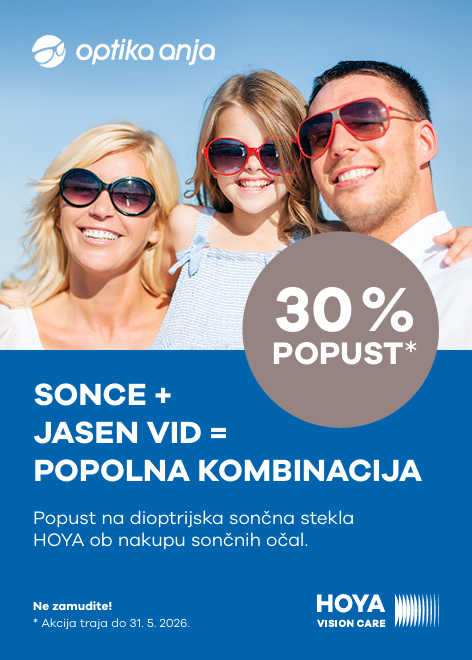 Ta poletje poskrbite za oči in stil hkrati – ob nakupu sončnih očal vam podarimo 30 % popust na dioptrijska sončna stekla HOYA. Vrhunska sončna zaščita in brezhibna ostrina vida v eni sami kombinaciji. Akcija velja do 31. 5. 2026 – ne zamudite!